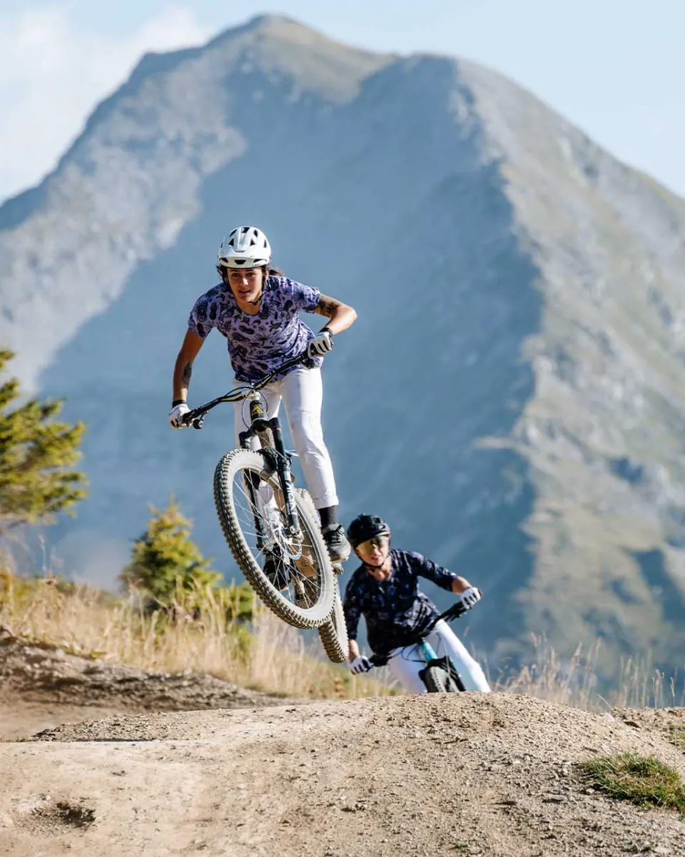 Made from 100% recycled polyester. The fabric is breathable and wicking, but nice and resistant to hold up on the trails.